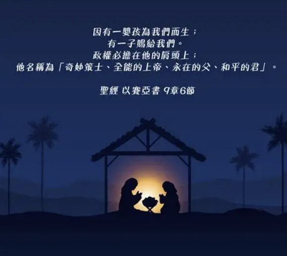 因 有 一 嬰 孩 為 我 們 而 生 ; 有 一 子 賜 給 我 們 。 政 權 必 擔 在 他 的 肩 頭 上 ; 他 名 稱 為 奇 妙 策 士 、 全 能 的 神 、 永 在 的 父 、 和 平 的 君 。(以 賽 亞 書 9:6